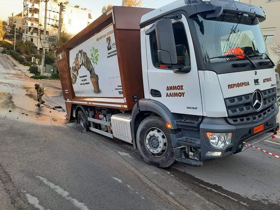 Η κυκλοφορία στο σημείο διεκόπη, ενώ συνεργείο του Δήμου Αλίμου παρενέβη προκειμένου να ξεκολλήσει το απορριμματοφόρο.