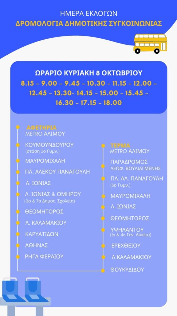 Με σκοπό τη διευκόλυνση των πολιτών στη μετακίνησή τους από και προς τα εκλογικά κέντρα την Κυριακή των εκλογών (8 Οκτωβρίου), η Δημοτική Συγκοινωνία Αλίμου θα λειτουργήσει εκτάκτως, με το δρομολόγιο και το ωράριο που φαίνεται παρακάτω στη φωτογραφία.