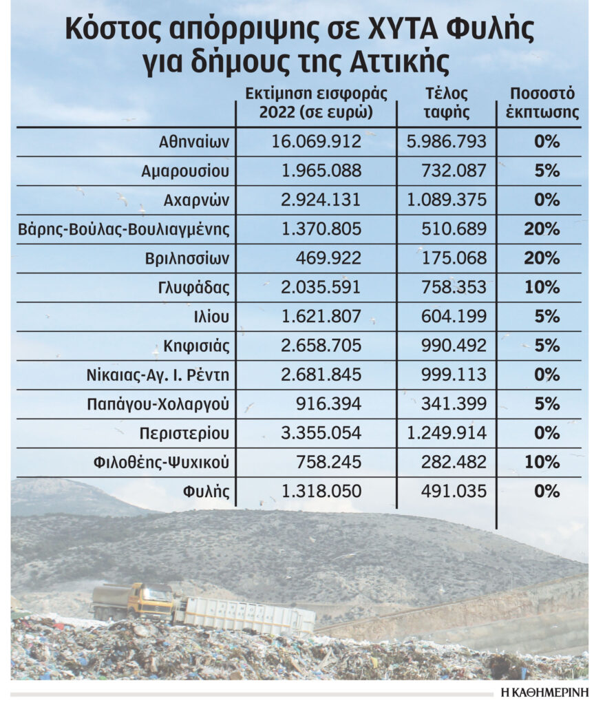 Οι 66 συνολικά δήμοι θα κληθούν να καταβάλουν στον ΕΔΣΝΑ (Ενιαίος Διαβαθμιδικός Σύνδεσμος Νομού Αττικής), τον φορέα που διαχειρίζεται τη Φυλή, 93.058.907 ευρώ το 2022 για τα σκουπίδια τους. Ο υπολογισμός έχει πραγματοποιηθεί με βάση τις ποσότητες που κατέληξαν στον ΧΥΤΑ το 2020, ωστόσο δεν αναμένονται σημαντικές μεταβολές. Το ποσό αυτό μαζί με το τέλος ταφής θα εκτιναχθεί συνολικά στα 127.727.698 ευρώ, βγάζοντας εκτός προϋπολογισμού πολλούς δήμους.