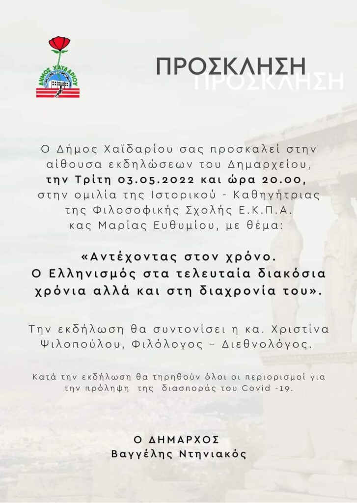 Η εκδήλωση με θέμα: «Αντέχοντας στον χρόνο. Ο Ελληνισμός στα τελευταία διακόσια χρόνια αλλά και στη διαχρονία του», θα φιλοξενηθεί στο δημαρχείο Χαϊδαρίου