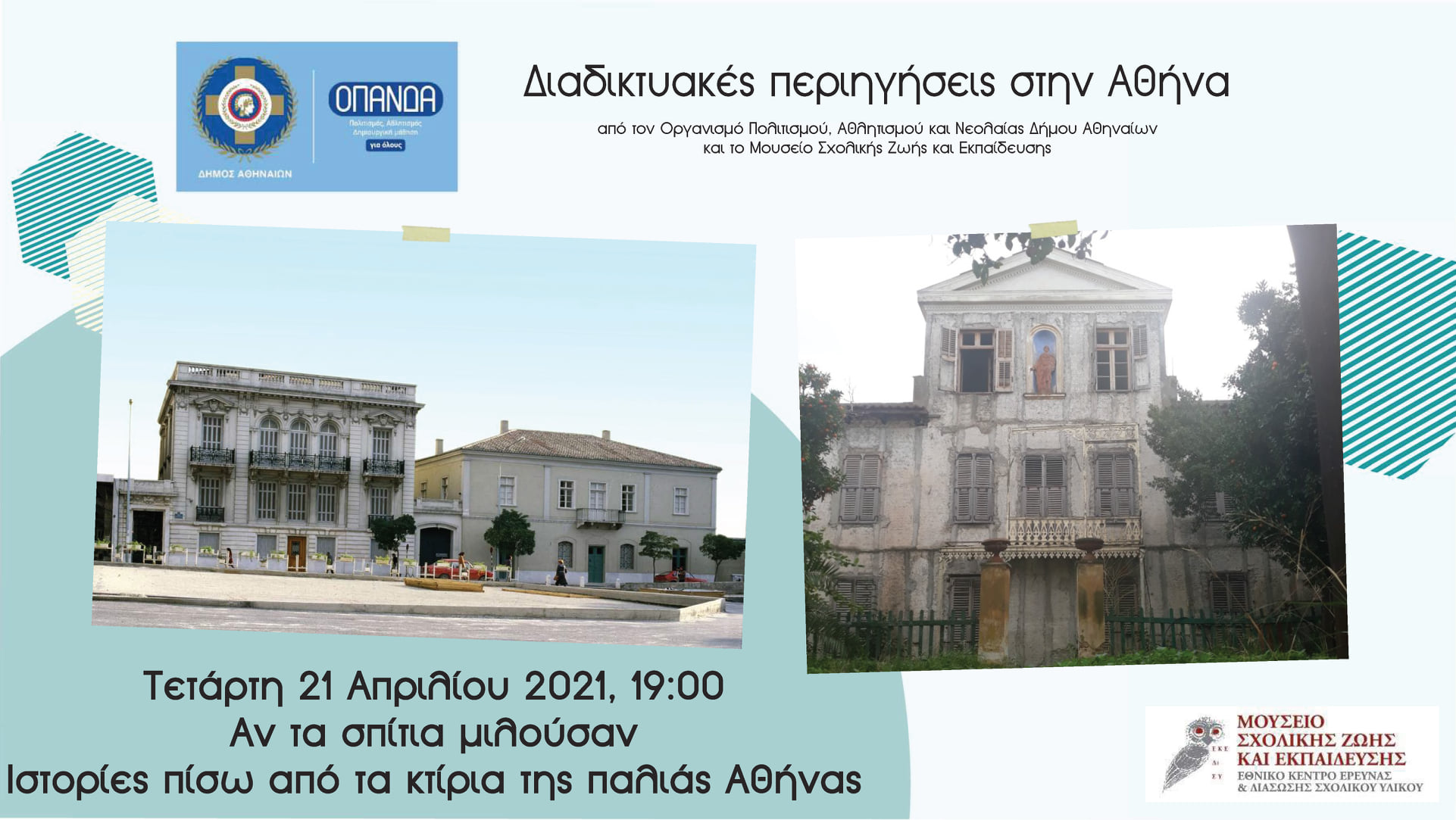 Ο Οργανισμός Πολιτισμού, Αθλητισμού και Νεολαίας του Δήμου Αθηναίων (ΟΠΑΝΔΑ) και το Μουσείο Σχολικής Ζωής και Εκπαίδευσης συνεχίζουν τις θεματικές διαδικτυακές περιηγήσεις στην Αθήνα, την Τετάρτη 21 Απριλίου στις 19:00, μέσα από τη σελίδα του ΟΠΑΝΔΑ στο facebook.