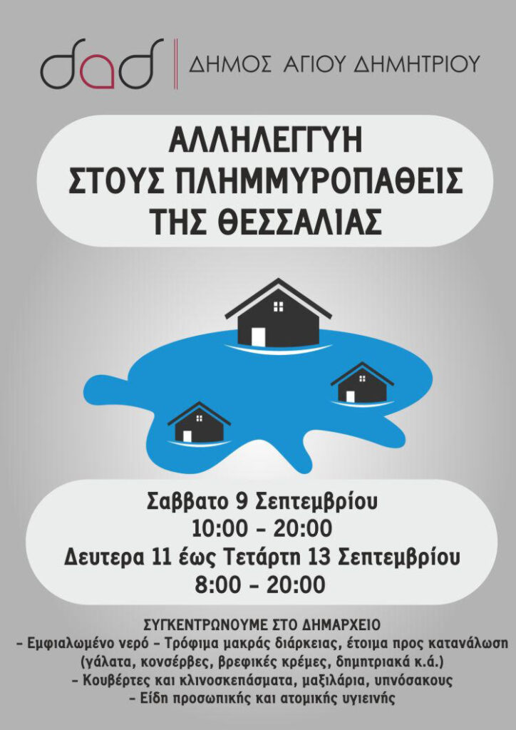 Όπως επισημαίνεται, η παραλαβή των προσφορών από τους πολίτες που επιθυμούν να εκφράσουν την αλληλεγγύη τους στις πληγείσες περιοχές θα γίνεται στο ισόγειο του δημαρχείου Αγίου Δημητρίου (Αγίου Δημητρίου 55).