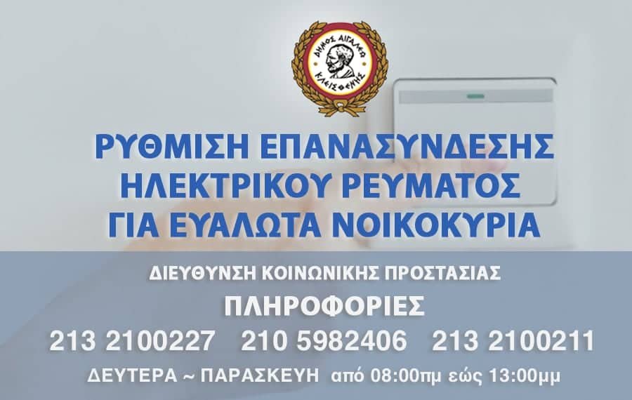 Ο Δήμος Αιγάλεω ενημέρωσε ότι επεκτείνεται η ρύθμιση που αφορά στην επανασύνδεση του ηλεκτρικού ρεύματος για ευάλωτα νοικοκυριά, τα οποία έχουν αποσυνδεθεί από το δίκτυο παροχής ηλεκτρικής ενέργειας λόγω ληξιπρόθεσμων οφειλών.