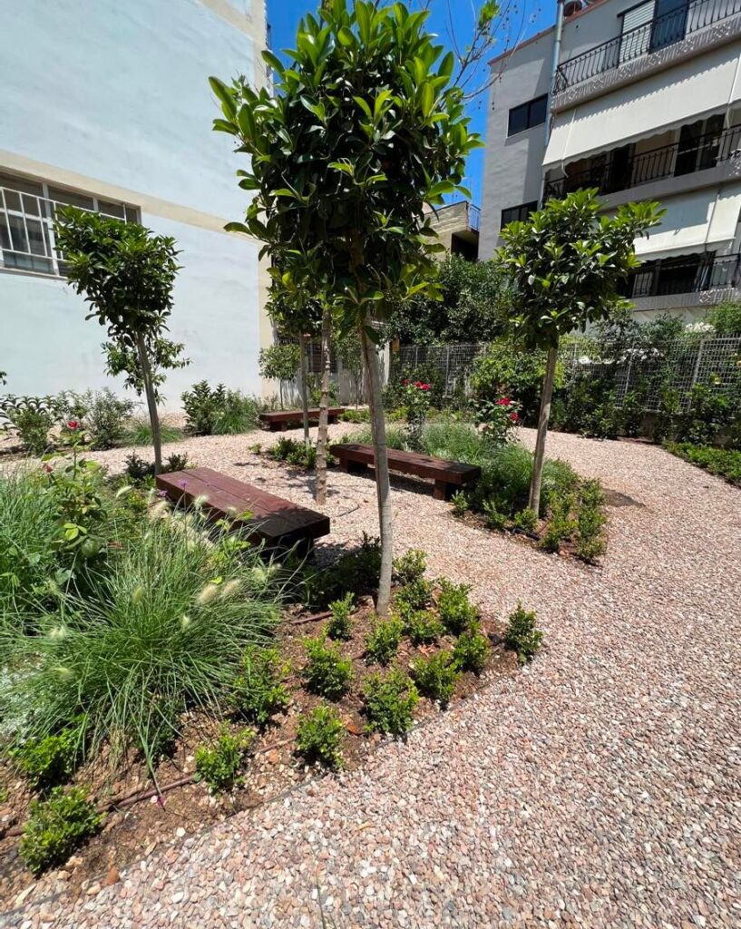 Για τη διαμόρφωση των χώρων αυτών επιλέγονται δέντρα και φυτά ανθεκτικά στις υψηλές θερμοκρασίες και την ατμόσφαιρα της πόλης. Η τοποθέτηση αρκετών καθιστικών είναι βασική προϋπόθεση για την επιτυχία του ζητούμενου στόχου, που είναι να δημιουργηθεί ένα σημείο αναφοράς των κατοίκων της γειτονιάς για τον περίπατό τους.
