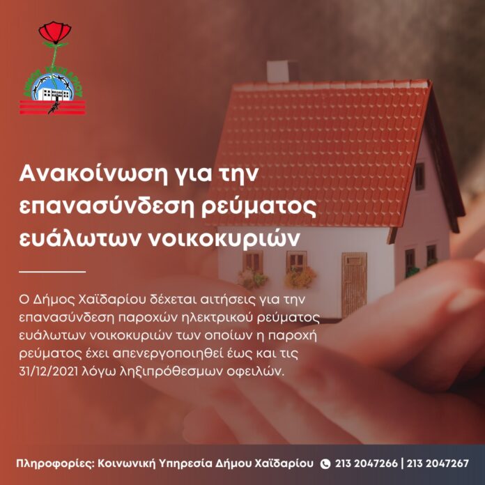 Ο Δήμος Χαϊδαρίου ενημέρωσε ότι δέχεται αιτήσεις για την επανασύνδεση παροχών ηλεκτρικού ρεύματος ευάλωτων νοικοκυριών, των οποίων η παροχή ρεύματος έχει απενεργοποιηθεί έως και τις 31/12/2021 λόγω ληξιπρόθεσμων οφειλών.