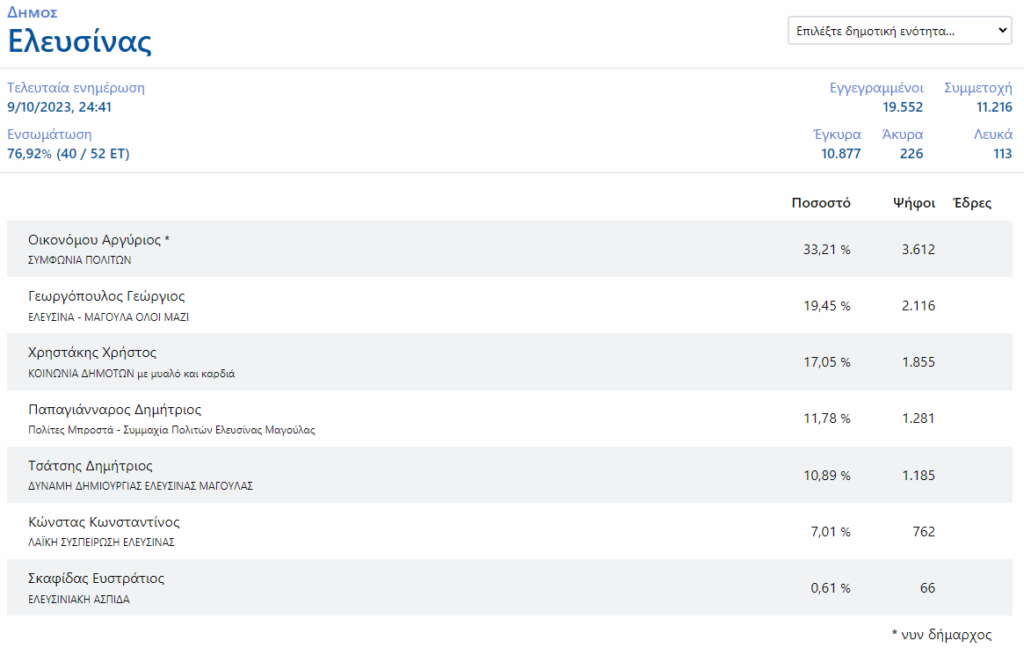Περίπου 14 ποσοστιαίες μονάδες η διαφορά του νυν με τον πρώην δήμαρχο Ελευσίνας – Εξαιρετική παρουσία και ποσοστό για τον συνδυασμό του Χρ. Χρηστάκη