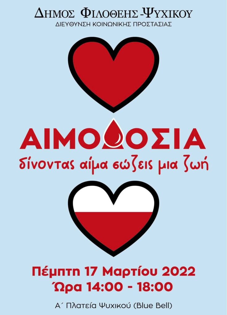 Στη διοργάνωση εθελοντικής αιμοδοσίας για την ενίσχυση της δημοτικής τράπεζας αίματος, με σκοπό να καλυφθούν οι ανάγκες που υπάρχουν, προχωρά την Πέμπτη 17 Μαρτίου ο Δήμος Φιλοθέης – Ψυχικού.