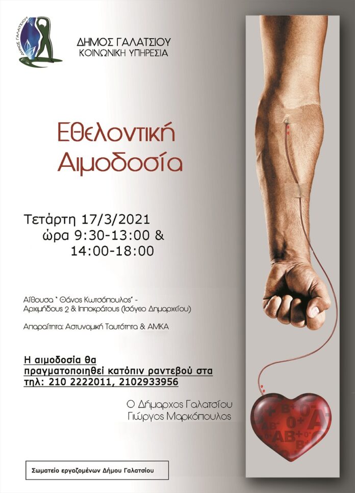 Ο Δήμος Γαλατσίου διοργανώνει εθελοντική αιμοδοσία την Τετάρτη 17 Μαρτίου, στο δημαρχείο της πόλης, κατόπιν ραντεβού στα τηλέφωνα 210.2222.011 και 210.2933.956.