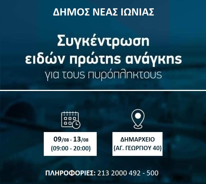 Στη συλλογή τροφίμων και ειδών πρώτης ανάγκης, από τη Δευτέρα 9 Αυγούστου έως την Παρασκευή 13 Αυγούστου, ανακοίνωσε ότι προχωρά ο Δήμος Νέας Ιωνίας απευθύνοντας κάλεσμα προς τους πολίτες και τις τοπικές επιχειρήσεις.