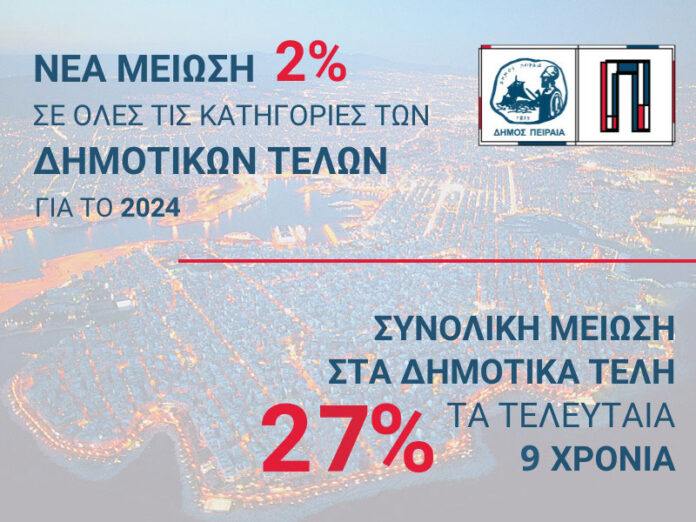 Για ακόμη μια χρονιά ο Δήμος Πειραιά προχωρά σε νέα μείωση 2% σε όλες τις κατηγορίες των ανταποδοτικών τελών για το 2024, όπως και σε σημαντικές οικονομικές ελαφρύνσεις για τη στήριξη δημοτών, επιχειρήσεων και ευπαθών ομάδων της πόλης.