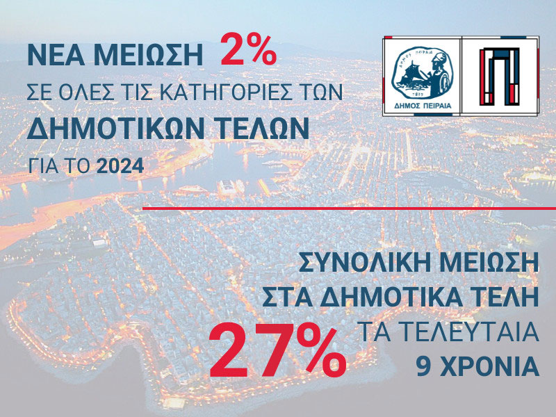 Για ακόμη μια χρονιά ο Δήμος Πειραιά προχωρά σε νέα μείωση 2% σε όλες τις κατηγορίες των ανταποδοτικών τελών για το 2024, όπως και σε σημαντικές οικονομικές ελαφρύνσεις για τη στήριξη δημοτών, επιχειρήσεων και ευπαθών ομάδων της πόλης.