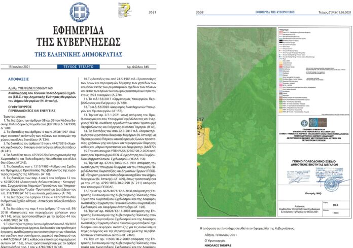 Δημοσιεύθηκε την Τρίτη 15 Ιουνίου, στο ΦΕΚ 345/15.06.2021, τεύχος Δ’, η «Αναθεώρηση του Γενικού Πολεοδομικού Σχεδίου (Γ.Π.Σ.) της Δημοτικής Ενότητας Μεγαρέων του Δήμου Μεγαρέων (Ν. Αττικής)».