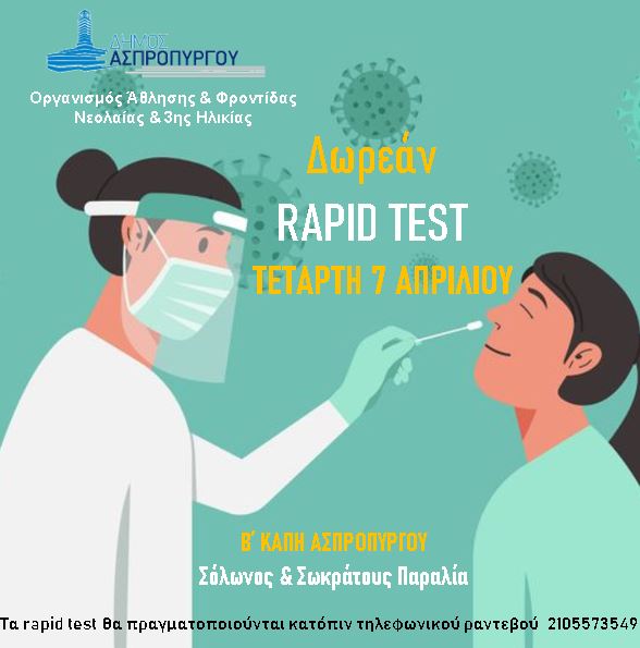 Εκ νέου δειγματοληπτικούς ελέγχους μέσω rapid tests για τον κορωνοϊό θα πραγματοποιηθούν αύριο, Τετάρτη 7 Απριλίου, στο χώρο του Β’ ΚΑΠΗ του Δήμου Ασπροπύργου, στην περιοχή της Παραλίας, έπειτα από τη μαζική ανταπόκριση των δημοτών την προηγούμενη εβδομάδα.