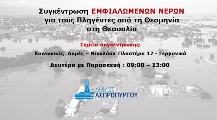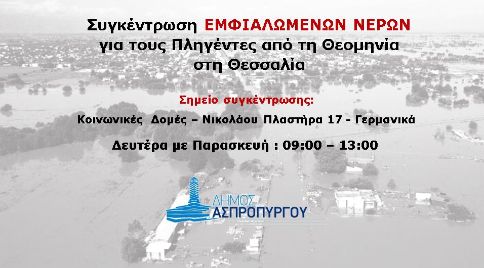 Μέχρι την Παρασκευή 15 Σεπτεμβρίου, ο Δήμος Ασπροπύργου και πολίτες συγκεντρώνουν εμφιαλωμένα νερά για τους πληγέντες από τις φονικές πλημμύρες στη Θεσσαλία
