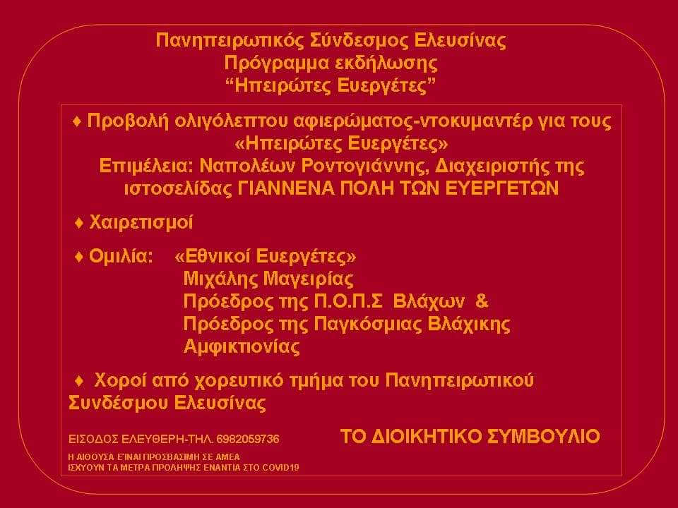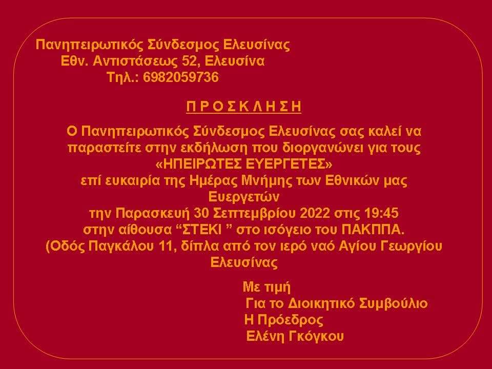 Εκδήλωση για τους Ηπειρώτες Ευεργέτες, με αφορμή την Ημέρα Μνήμης των εθνικών μας ευεργετών, διοργανώνει την Παρασκευή 30 Σεπτεμβρίου ο Πανηπειρωτικός Σύνδεσμος Ελευσίνας.