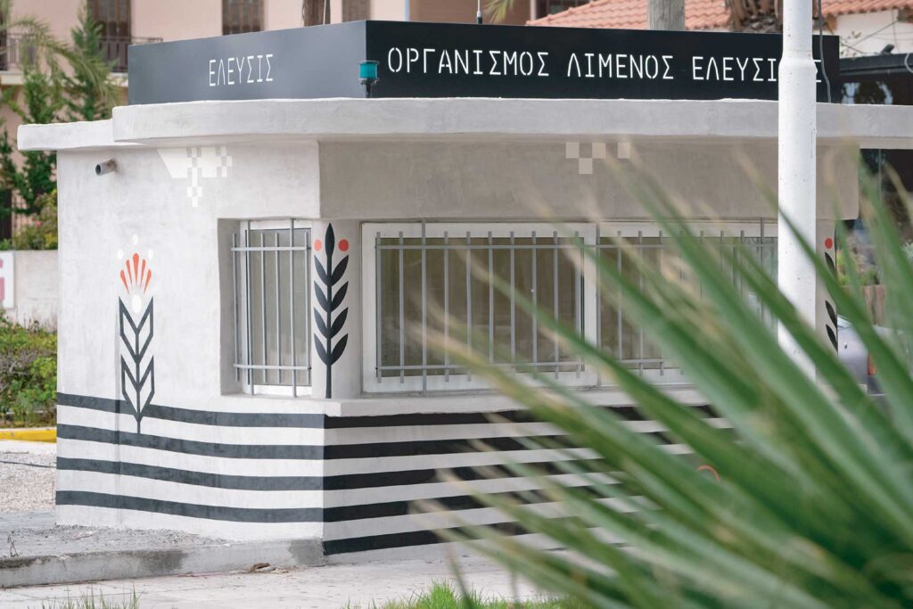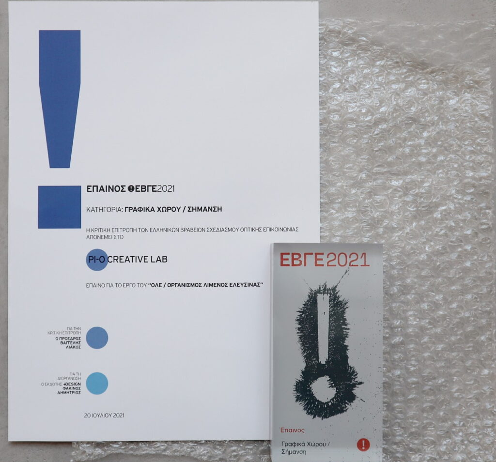 Ειδικότερα, έπαινος “ΕΒΓΕ 2021” στην κατηγορία Γραφικά Χώρου/Σήμανση απονεμήθηκε στο δημιουργικό της εταιρείας Pi-o Creative Lab για τις σύγχρονες τοιχογραφίες, με αναφορές στην ιστορία και τα αρχαία σύμβολα της Ελευσίνας σε συνδυασμό με τη θάλασσα, που πραγματοποίησε στο κτήριο του Ο.Λ.Ε. Α.Ε. που βρίσκεται στην είσοδο της προβλήτας της πρώην Αμερικανικής Βάσης και στον ιστορικό πέτρινο οικίσκο (πρώην περίπτερο Αντώνη Φονιά), το οποίο έχει πλέον παραχωρηθεί στον Δήμο Ελευσίνας.