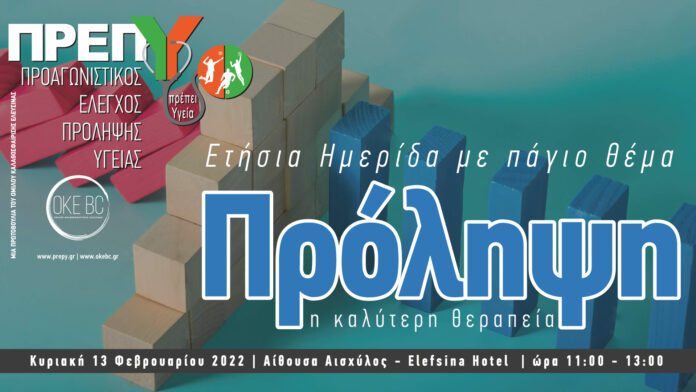 Ο Όμιλος Καλαθοσφαίρισης Ελευσίνας, ως φορέας υλοποίησης της πρωτοβουλίας ΠΡ.Ε.Π.Υ. και ως ιδρυτής της «Προ-αγωνιστικός Έλεγχος Πρόληψης Υγείας ΑΜΚΕ», διοργανώνει την Κυριακή 13 Φεβρουαρίου την καθιερωμένη ετήσια ημερίδα του, με τίτλο: «Πρόληψη, η καλύτερη θεραπεία» και ειδικό θέμα τη φετινή χρονιά «Πρόληψη στις Αναπτυξιακές Ηλικίες».