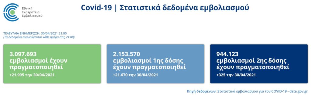 Συνεχίζεται με αμείωτο και ικανοποιητικό ρυθμό το εμβολιαστικό πρόγραμμα της χώρας κατά του κορωνοϊού