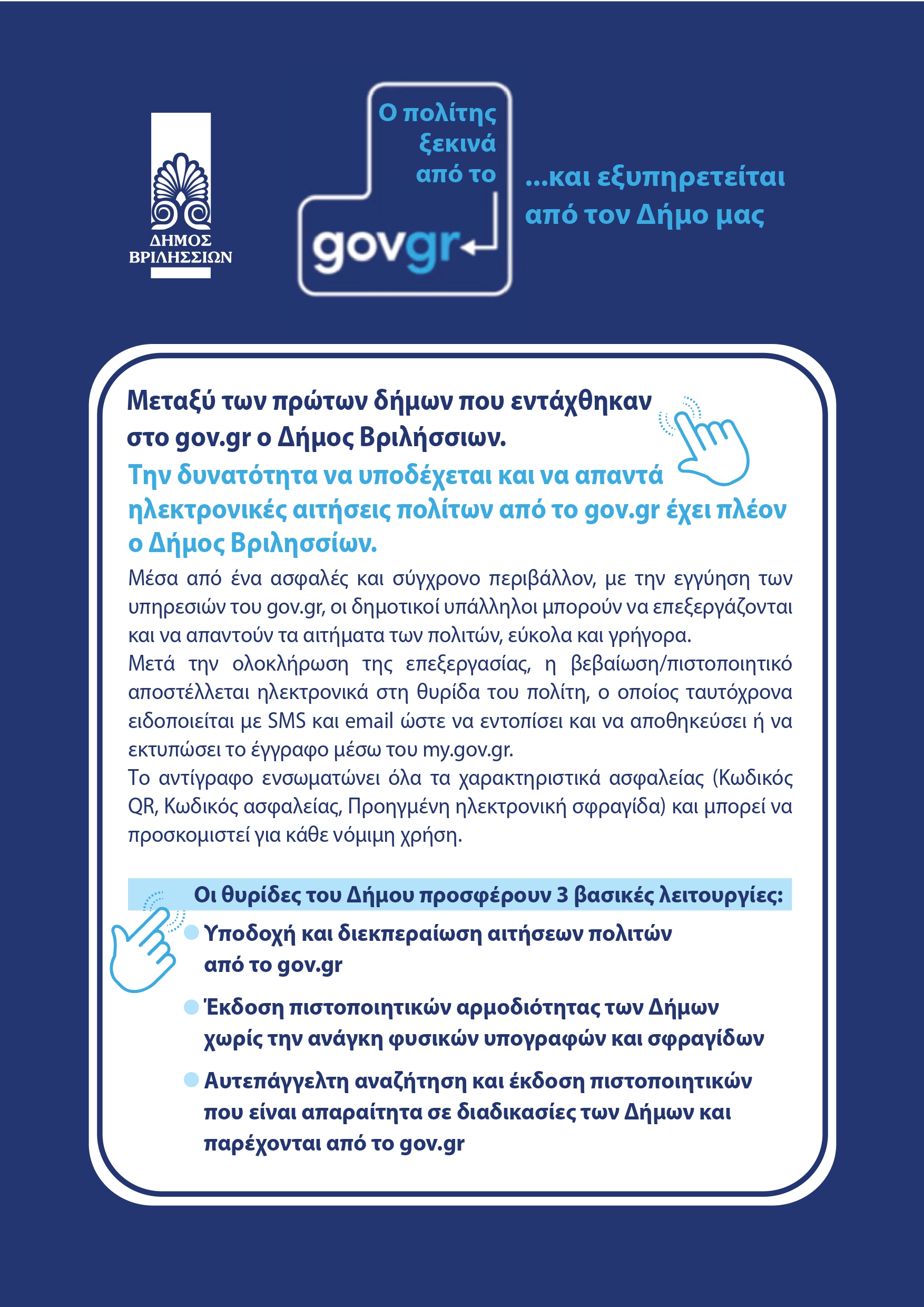 Τη δυνατότητα να υποδέχεται και να απαντά ηλεκτρονικές αιτήσεις πολίτων από το gov.gr απέκτησε ο Δήμος Βριλησσίων.