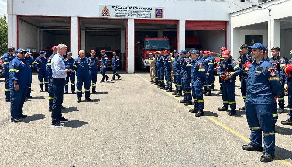 Ο υπουργός Κλιματικής Κρίσης και Πολιτικής Προστασίας επισκέφθηκε, μεταξύ άλλων, τις εγκαταστάσεις των Πυροσβεστικών Υπηρεσιών Ελευσίνας και Μεγάρων και την 1η ΕΜΑΚ στην περιοχή Μαγούλας-Ασπροπύργου