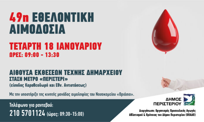 O Οργανισμός Προσχολικής Αγωγής Αθλητισμού και Πρόνοιας του Δήμου Περιστερίου (ΟΠΑΑΠ) διοργανώνει την Τετάρτη 18 Ιανουαρίου την 49η εθελοντική αιμοδοσία, με την υποστήριξη της κινητής μονάδας αιμοληψίας του Γενικού Νοσοκομείου Ελευσίνας «Θριάσιο».