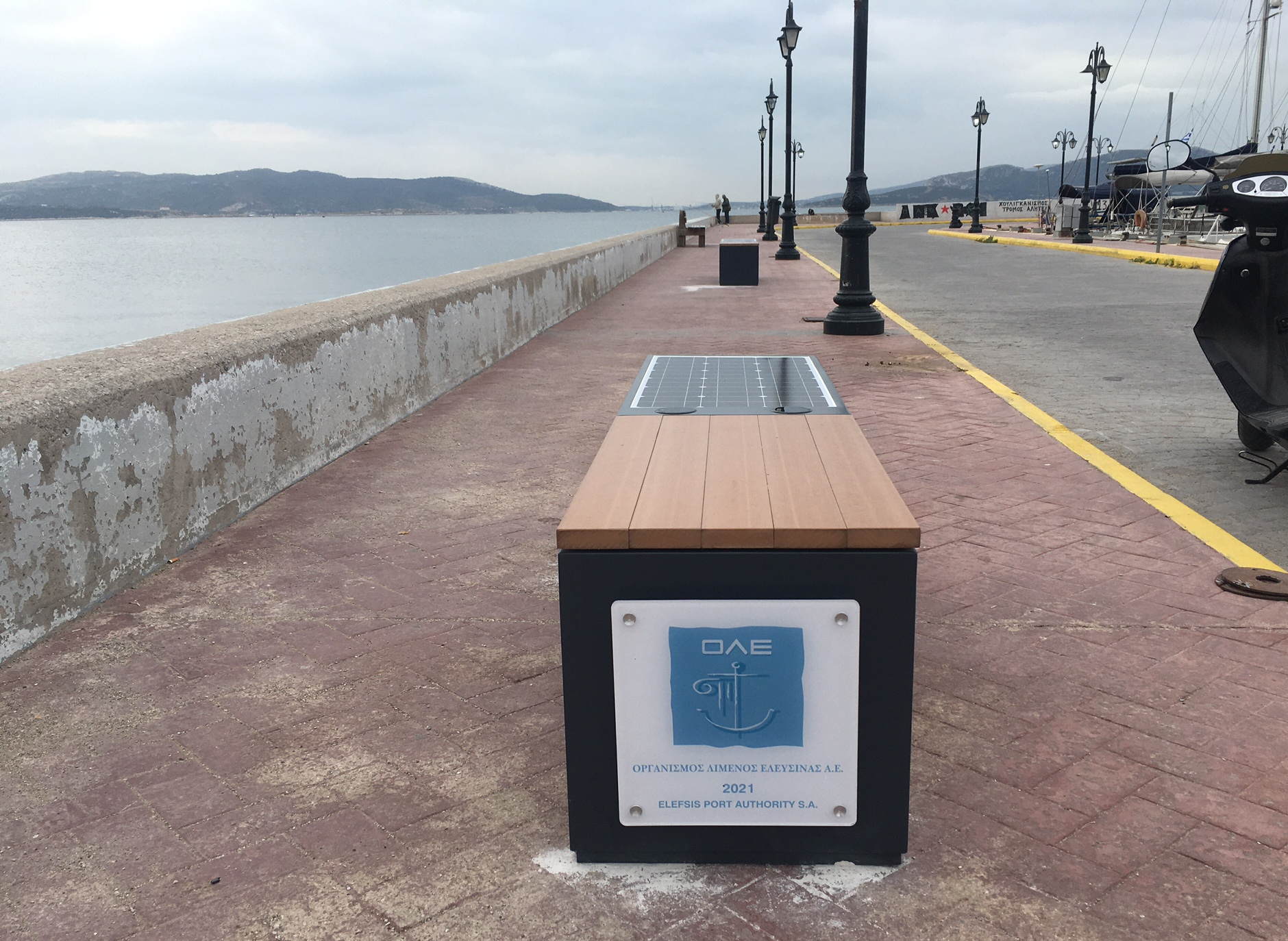 «Έξυπνα» ηλιακά παγκάκια τοποθέτησε ο Οργανισμός Λιμένος Ελευσίνας Α.Ε. σε χώρους αναψυχής και περιπάτου της χερσαίας ζώνης λιμένος της πόλης και συγκεκριμένα στη θέση Νέα Μαρίνα, σε μια προσπάθεια αναβάθμισης του παραλιακού μετώπου.