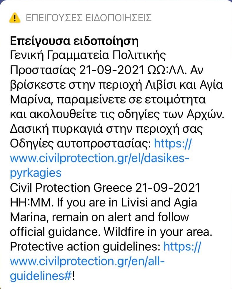 Με επείγουσα ειδοποίηση που απέστειλε πριν από λίγο η Γενική Γραμματεία Πολιτικής Προστασίας, ενημερώνει τους κατοίκους που βρίσκονται στις περιοχές Λιβίσι και Αγία Μαρίνα, να παραμείνουν σε ετοιμότητα και να ακολουθήσουν τις οδηγίες των Αρχών.