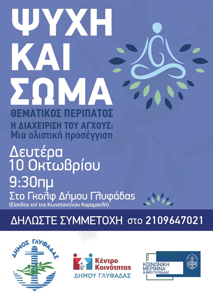 Με αφορμή την Παγκόσμια Ημέρα Ψυχικής Υγείας που εορτάζεται στις 10 Οκτωβρίου, με πρωτοβουλία του Δήμου Γλυφάδας, διοργανώνεται θεματικός περίπατος στις εγκαταστάσεις του Γκολφ (επί της οδού Κωνσταντίνου Καραμανλή) με τίτλο: «Ψυχή και Σώμα».