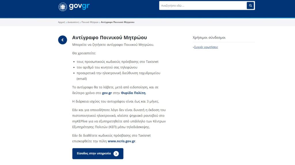 Η διαδικασία είναι ιδιαίτερα απλή. Ειδικότερα, οι πολίτες εισέρχονται στην πλατφόρμα poiniko.services.gov.gr, ταυτοποιούνται με χρήση των κωδικών τους στο Taxisnet και αιτούνται την έκδοση αντιγράφου ποινικού μητρώου, το οποίο θα εκδίδεται ύστερα από λίγες ημέρες. Μόλις το αντίγραφο ποινικού μητρώου είναι έτοιμο, οι ενδιαφερόμενοι θα ειδοποιούνται με SMS ή e-mail, ώστε να το παραλάβουν από τη θυρίδα τους στο gov.gr.