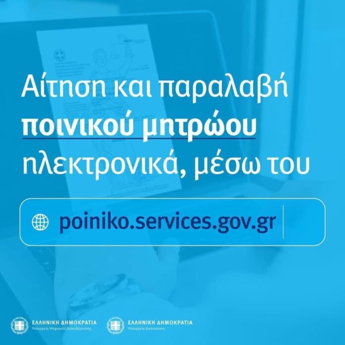 Ηλεκτρονικά θα πραγματοποιείται από σήμερα, Τρίτη 23 Μαρτίου, μέσω του gov.gr, η υποβολή αίτησης χορήγησης και η παραλαβή αντιγράφου ποινικού μητρώου γενικής χρήσης από πολίτες, σύμφωνα με την κοινή υπουργική απόφαση που συνυπέγραψαν ο υπουργός Ψηφιακής Διακυβέρνησης, Κυριάκος Πιερρακάκης και ο υφυπουργός Δικαιοσύνης, Γιώργος Κώτσηρας.