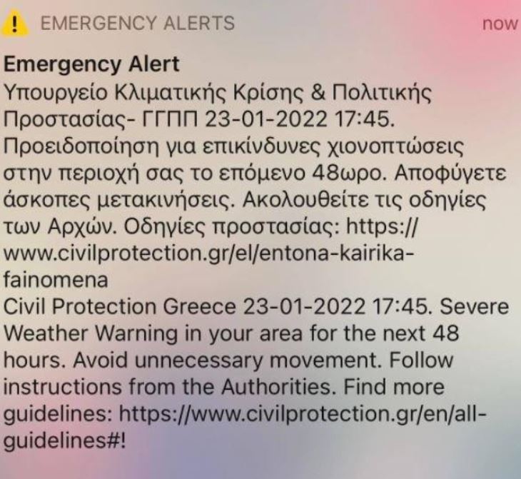 Το απόγευμα της Κυριακής, η Πολιτική Προστασία απέστειλε μέσω του 112 μήνυμα στους κατοίκους της Βόρειας και της Ανατολικής Αττικής, καθώς και σε Μαγνησία, Σποράδες, Φθιώτιδα, Εύβοια, Βόρειες Κυκλάδες και Λήμνο, με το οποίο προειδοποιεί για επικίνδυνες χιονοπτώσεις τις επόμενες 48 ώρες.