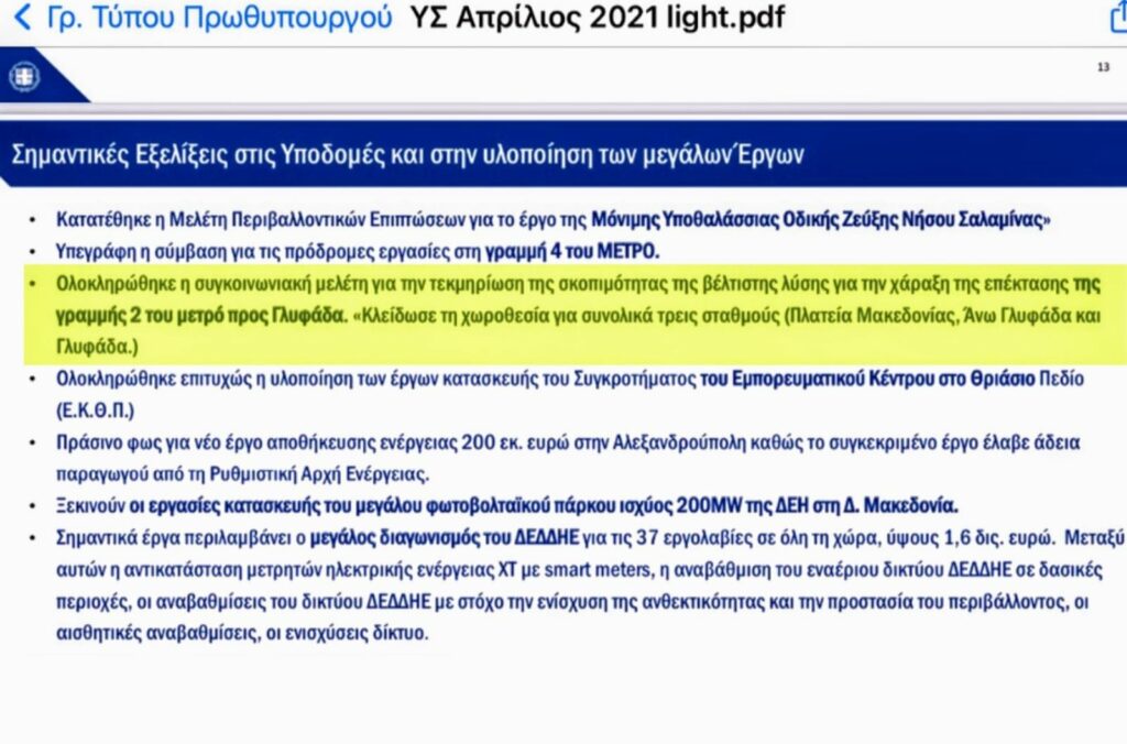 Αναλυτικότερα, ολοκληρώθηκε η συγκοινωνιακή μελέτη για την τεκμηρίωση της σκοπιμότητας της βέλτιστης λύσης για τη χάραξη της επέκτασης της γραμμής 2 του Μετρό στα νότια προάστια της Αττικής, ενώ στην περιοχή της Γλυφάδας θα χωροθετηθούν συνολικά τρεις σταθμοί: Πλατεία Μακεδονίας, Άνω Γλυφάδα και Γλυφάδα.