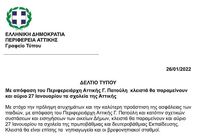 «Με στόχο την πρόληψη ατυχημάτων και την καλύτερη προάσπιση της ασφάλειας των παιδιών, με απόφαση του Περιφερειάρχη Αττικής Γ. Πατούλη και κατόπιν σχετικών συστάσεων και εισηγήσεων των οικείων Δήμων, τα σχολεία πρωτοβάθμιας και δευτεροβάθμιας Εκπαίδευσης θα παραμείνουν κλειστά και δε θα πραγματοποιηθούν δια ζώσης μαθήματα αύριο Πέμπτη 27 Ιανουαρίου. Να σημειωθεί ότι η λειτουργία ή μη των βρεφονηπιακών σταθμών αποτελεί ευθύνη των δήμων οι οποίοι και θα ενημερώσουν τους ενδιαφερόμενους».