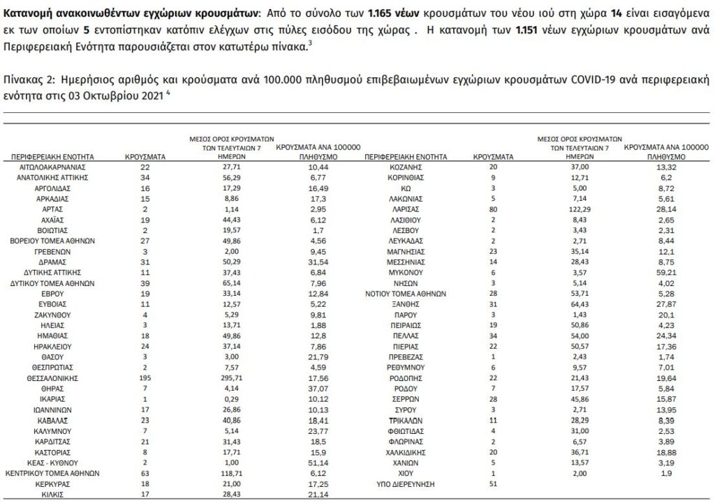 Σε 1.165 ανέρχονται τα νέα κρούσματα κορωνοϊού στη χώρα μας το τελευταίο 24ωρο, σύμφωνα με τον Εθνικό Οργανισμό Δημόσιας Υγείας (ΕΟΔΥ). Σήμερα, ανακοινώθηκαν ακόμα 31 θάνατοι.