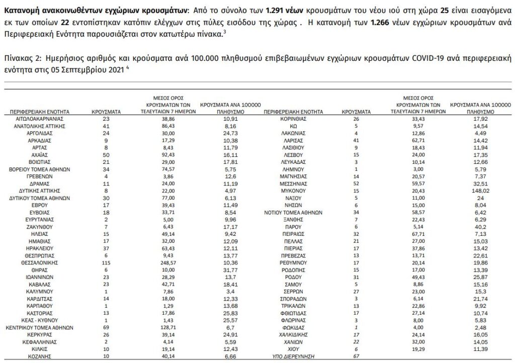 Τα νέα εργαστηριακά επιβεβαιωμένα κρούσματα της νόσου Covid-19, που καταγράφηκαν τις τελευταίες 24 ώρες από τον ΕΟΔΥ, είναι 1.291, εκ των οποίων 22 εντοπίστηκαν κατόπιν ελέγχων στις πύλες εισόδου της χώρας.