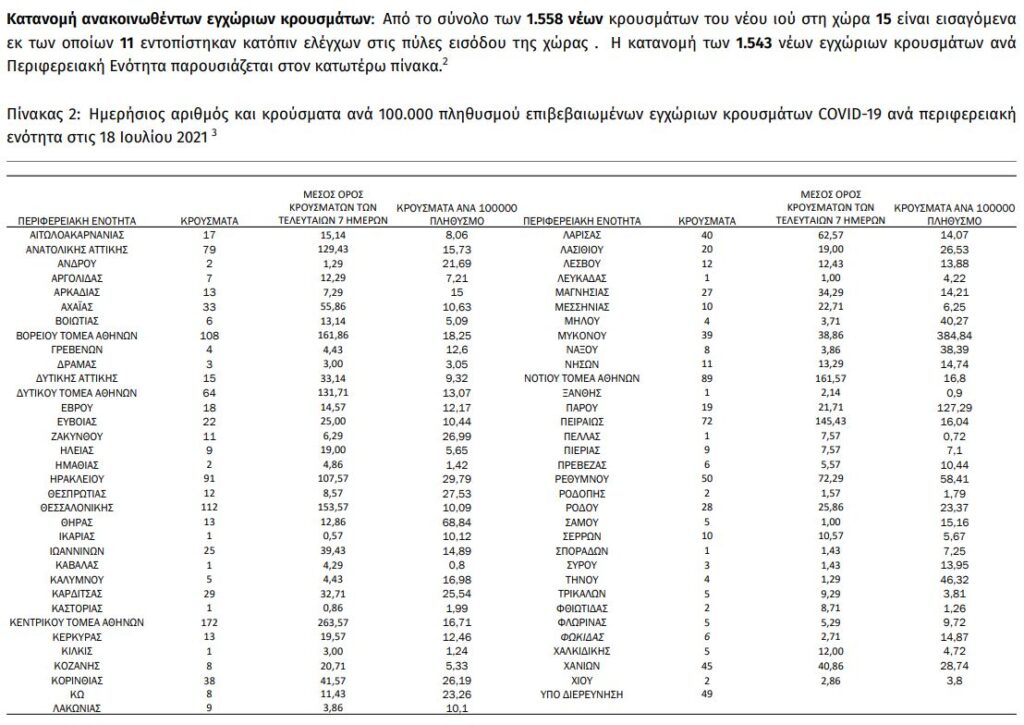 Από τα 1.558 νέα κρούσματα, τα 610 εντοπίστηκαν στην Αττική, τα 206 στην Κρήτη και τα 112 στη Θεσσαλονίκη.