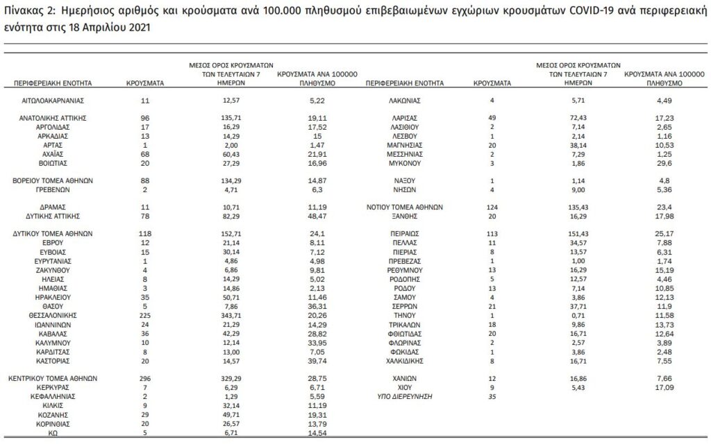 Τα στοιχεία που παρουσιάζονται αφορούν περιστατικά από την επιδημιολογική επιτήρηση της νόσου από το νέο κορωνοϊό (COVID-19), με βάση τα δεδομένα που έχουν δηλωθεί στον ΕΟΔΥ και καταγραφεί μέχρι τις 18 Απριλίου 2021 (ώρα 15:00).