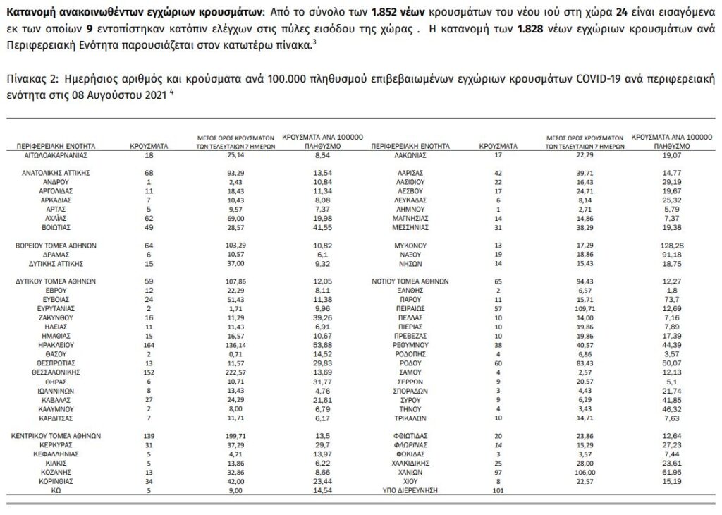 Τα νέα εργαστηριακά επιβεβαιωμένα κρούσματα της νόσου Covid-19, που καταγράφηκαν τις τελευταίες 24 ώρες από τον ΕΟΔΥ, είναι 1.852, εκ των οποίων 9 εντοπίστηκαν κατόπιν ελέγχων στις πύλες εισόδου της χώρας.