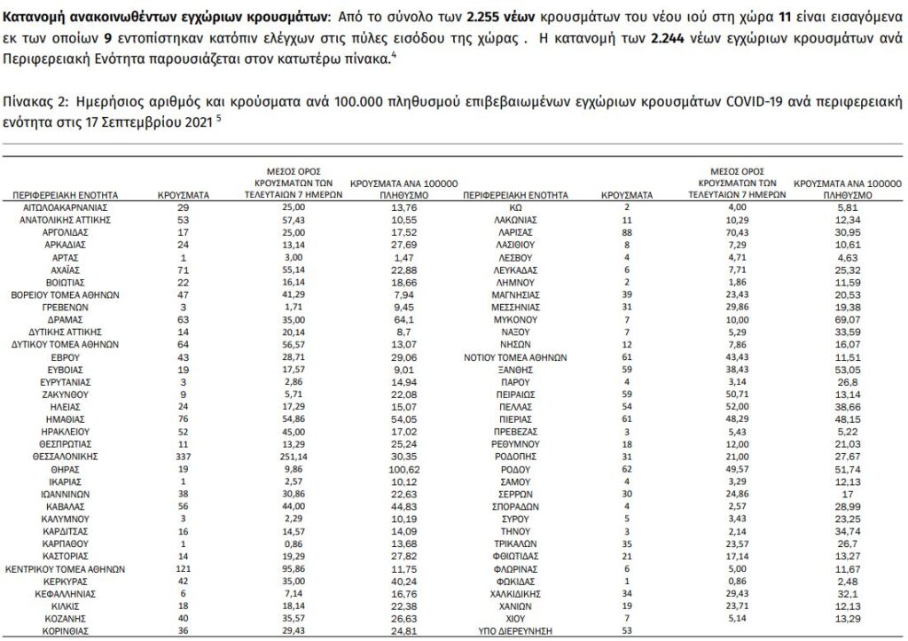 Από τα 2.255 νέα κρούσματα, τα 431 εντοπίζονται στην Αττική (505 χθες) και τα 337 στη Θεσσαλονίκη (300 χθες).