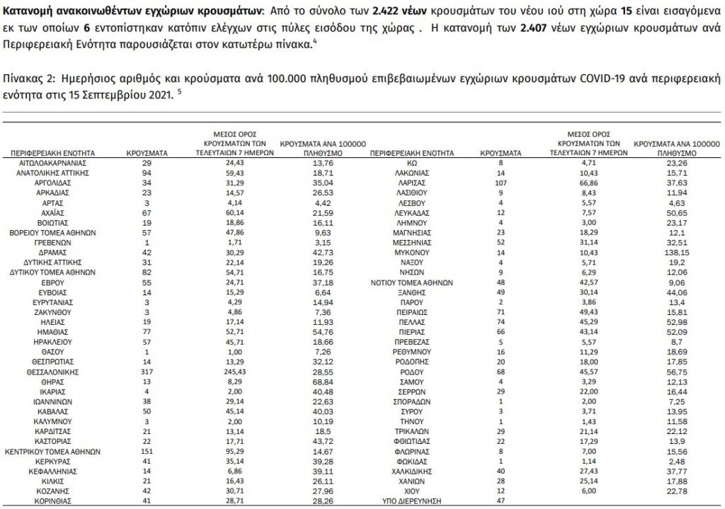 Από τα 2.422 νέα κρούσματα, τα 543 εντοπίζονται στην Αττική (606 χθες), τα 317 στη Θεσσαλονίκη (409 χθες).