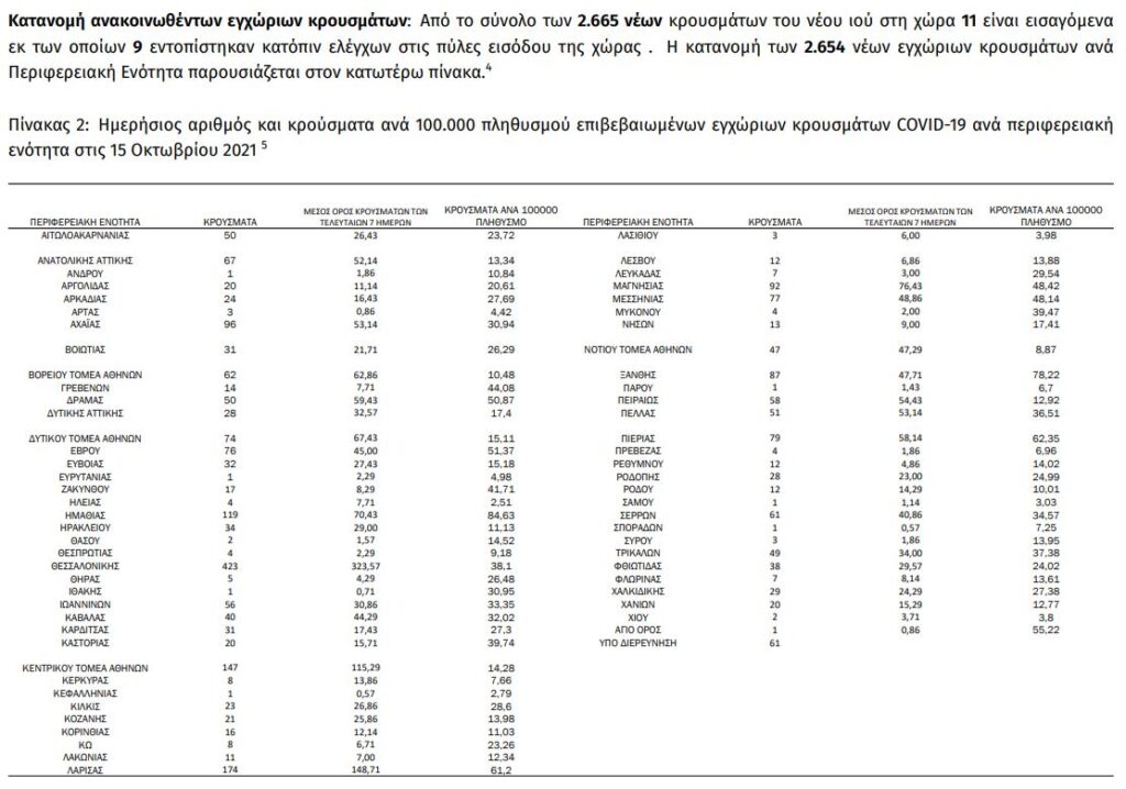 Σε 2.665 ανέρχονται τα νέα κρούσματα κορωνοϊού στη χώρα μας το τελευταίο 24ωρο, σύμφωνα με τον Εθνικό Οργανισμό Δημόσιας Υγείας (ΕΟΔΥ). Σήμερα, Παρασκευή 15 Οκτωβρίου, ανακοινώθηκαν ακόμα 27 θάνατοι ασθενών με Covid-19.