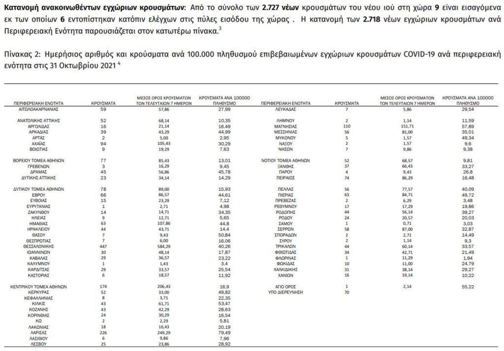 Σε 2.727 ανέρχονται τα νέα κρούσματα κορωνοϊού στη χώρα μας το τελευταίο 24ωρο, σύμφωνα με την ημερήσια επιδημιολογική έκθεση του Εθνικού Οργανισμού Δημόσιας Υγείας (ΕΟΔΥ). Σήμερα, Κυριακή 31 Οκτωβρίου, ανακοινώθηκαν ακόμα 44 θάνατοι ασθενών με Covid-19.