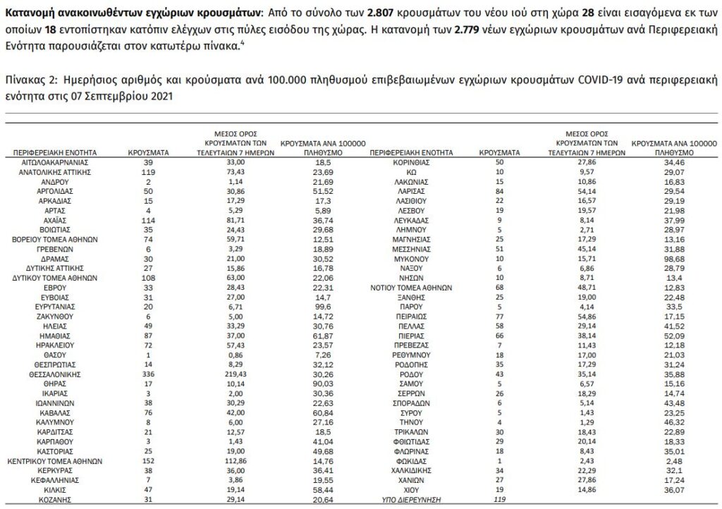 Σε 2.807 ανέρχονται τα νέα κρούσματα κορωνοϊού στη χώρα μας το τελευταίο 24ωρο, σύμφωνα με τον Εθνικό Οργανισμό Δημόσιας Υγείας (ΕΟΔΥ). Σήμερα, Τρίτη 7 Σεπτεμβρίου, ανακοινώθηκαν 38 θάνατοι, ενώ από την έναρξη της πανδημίας έχουν καταγραφεί συνολικά 13.971 θάνατοι.