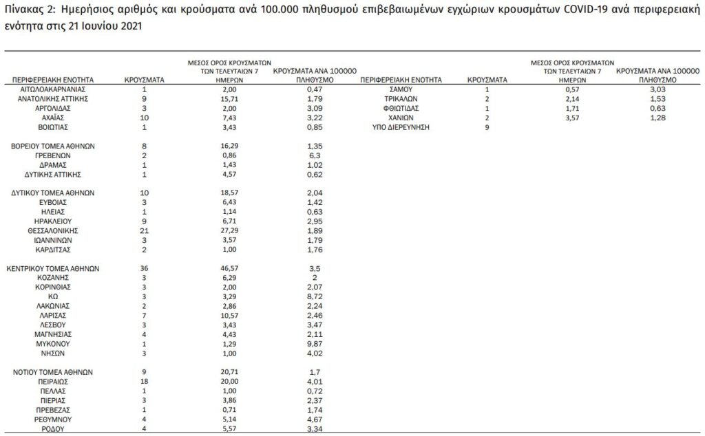 Mαζικές Δειγματοληψίες ΕΟΔΥ: Στις 20 Ιουνίου 2021, πραγματοποιήθηκαν 33 δράσεις δειγματοληπτικών ελέγχων από τις Κινητές Ομάδες Υγείας (ΚΟΜΥ) του ΕΟΔΥ, στις οποίες διενεργήθηκαν 3.145 έλεγχοι Rapid Ag και ανευρέθηκαν 22 θετικά (0,7%).