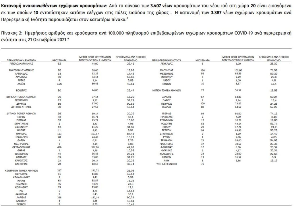 Σε 3.407 ανέρχονται τα νέα κρούσματα κορωνοϊού στη χώρα μας το τελευταίο 24ωρο, σύμφωνα με την ημερήσια επιδημιολογική έκθεση του Εθνικού Οργανισμού Δημόσιας Υγείας (ΕΟΔΥ). Σήμερα, Πέμπτη 21 Οκτωβρίου, ανακοινώθηκαν ακόμα 34 θάνατοι ασθενών με Covid-19.