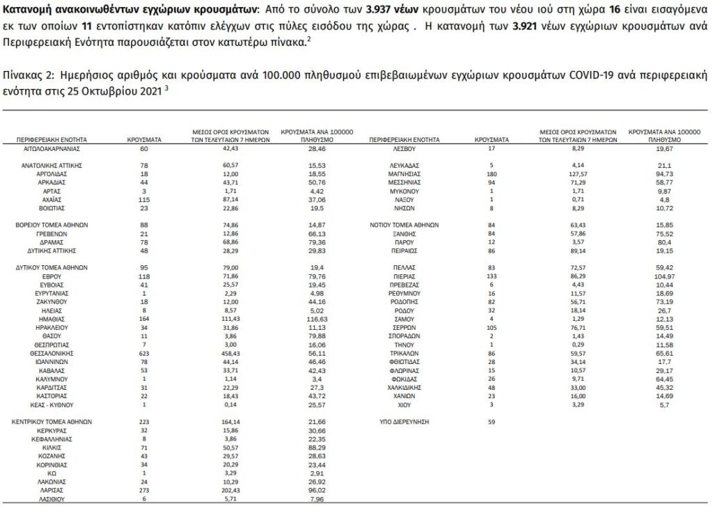 Σε 3.937 ανέρχονται τα νέα κρούσματα κορωνοϊού στη χώρα μας το τελευταίο 24ωρο, σύμφωνα με τον Εθνικό Οργανισμό Δημόσιας Υγείας (ΕΟΔΥ). Σήμερα, Δευτέρα 25 Οκτωβρίου, ανακοινώθηκαν ακόμα 54 θάνατοι.