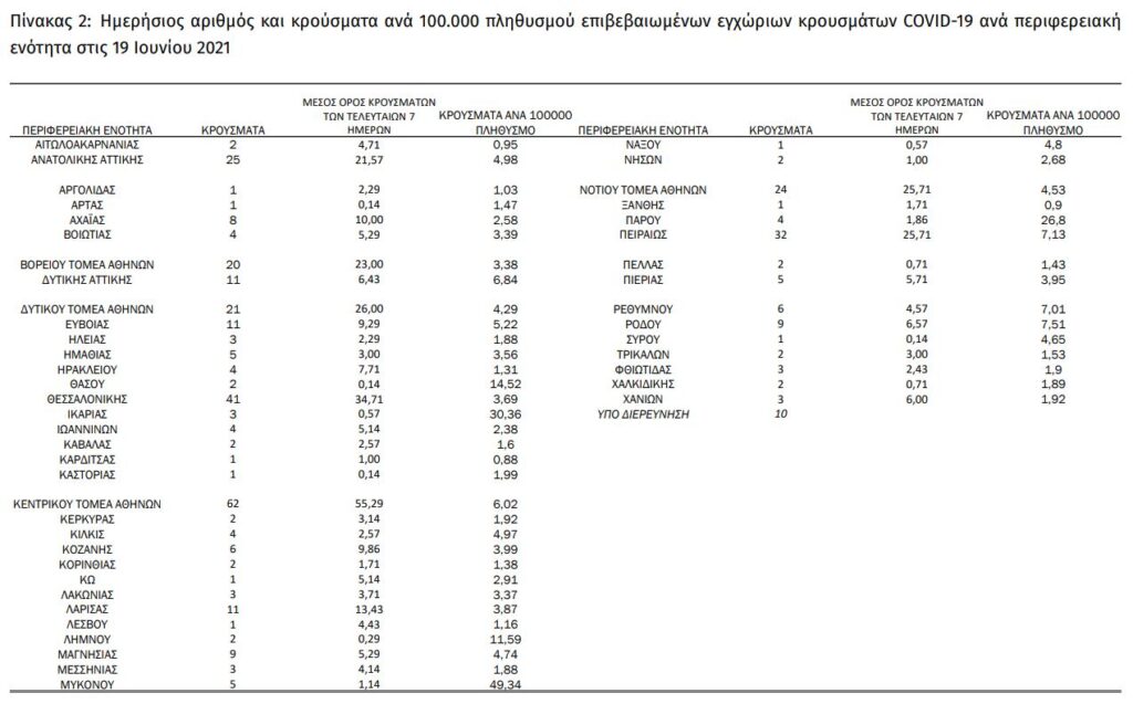 Mαζικές Δειγματοληψίες ΕΟΔΥ: Στις 18 Ιουνίου 2021, πραγματοποιήθηκαν 139 δράσεις δειγματοληπτικών ελέγχων από τις Κινητές Ομάδες Υγείας (ΚΟΜΥ) του ΕΟΔΥ, στις οποίες διενεργήθηκαν 11.648 έλεγχοι Rapid Ag και ανευρέθηκαν 50 θετικά (0,43%).