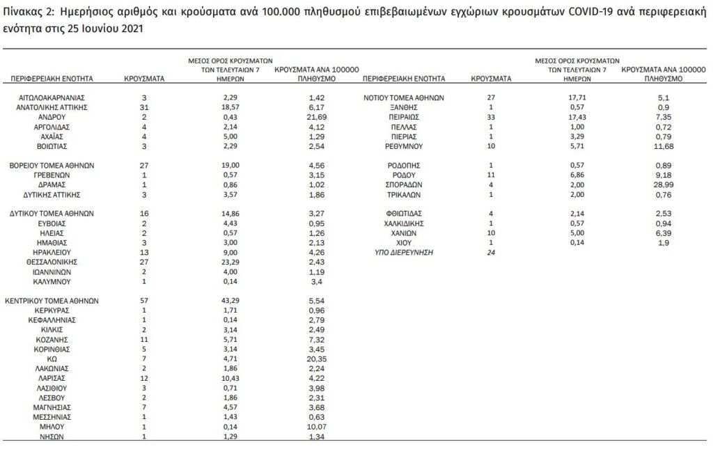 Mαζικές Δειγματοληψίες ΕΟΔΥ: Στις 24 Ιουνίου 2021, πραγματοποιήθηκαν 139 δράσεις δειγματοληπτικών ελέγχων από τις Κινητές Ομάδες Υγείας (ΚΟΜΥ) του ΕΟΔΥ, στις οποίες διενεργήθηκαν 7.296 έλεγχοι Rapid Ag και ανευρέθηκαν 48 θετικά (0,66%).