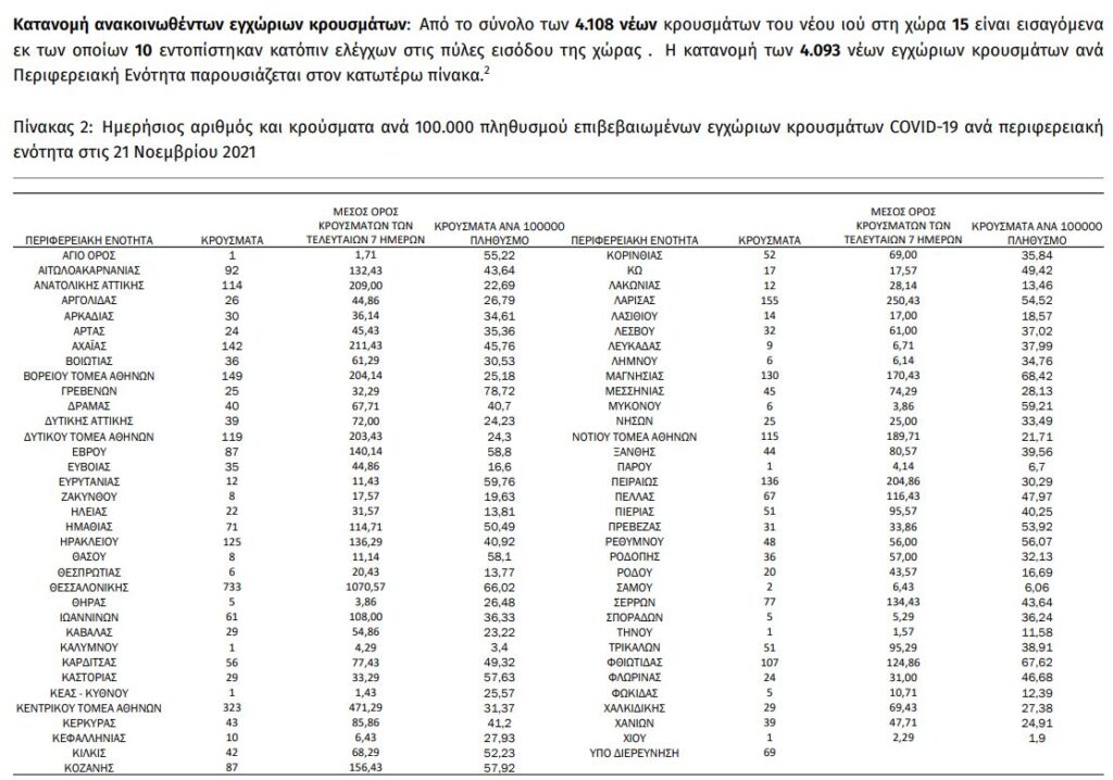Από τα 4.108 νέα κρούσματα, 1.020 εντοπίζονται στην Αττική και 733 στη Θεσσαλονίκη.