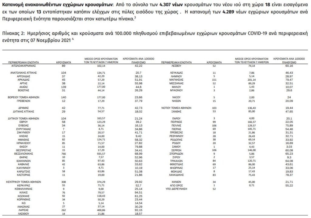 Σε 4.307 ανέρχονται τα νέα κρούσματα κορωνοϊού στη χώρα μας το τελευταίο 24ωρο, σύμφωνα με τον ΕΟΔΥ. Κατά το ίδιο διάστημα, κατεγράφησαν ακόμα 52 θάνατοι, με τον αριθμό των νεκρών από την εμφάνιση της πανδημίας στην Ελλάδα να φθάνει τους 16.295.